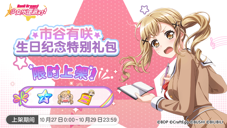 各位亲爱的BanG Dreamer: 为庆祝有咲的生日,游戏内现已上架全新生日礼包——「有咲生日纪念特别礼包」! 礼包内含付费星石、有咲生日纪念特别名片装饰及有咲专用技能练习券。本轮次登场的各位成员的生日纪念特别装饰都将拥有自己独一无二的表情哦!喜欢的话还请不要错过呀! ※本次生日纪念特别名片装饰为全新简中版原创定制,由衷地希望大家能够喜欢ヽ(´•ω•`)、
