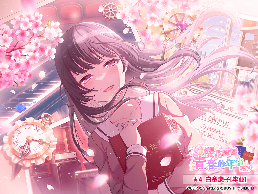 今日起,每一天我们将为大家展示「毕业 〜奔向未来〜」活动中出现的成员卡面哦!此次为大家介绍的卡面为——白金燐子[毕业]※当期活动招募中期间限定成员将加入卡池,活动期间出现概率提升~