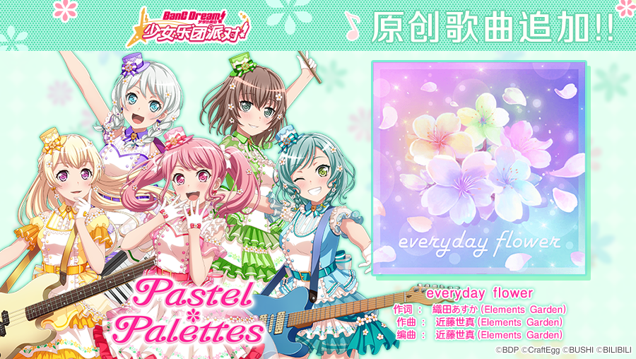 在缤纷绽放的花朵中,有一丝飘香的落寞。当你们拥抱温暖的回忆,迈向全新的世界时,我将为你送上最盛大的祝福。★歌曲追加★曲名:everyday flower演唱:Pastel*Palettes※追加的原创歌曲将于10月22日维护后发放至大家的礼物箱,届时还请您登录游戏领取~