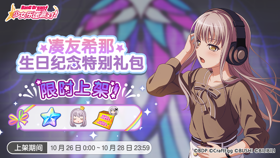 各位亲爱的BanG Dreamer: 为庆祝友希那的生日,游戏内现已上架全新生日礼包——「友希那生日纪念特别礼包」! 礼包内含付费星石、友希那生日纪念特别名片装饰及友希那专用技能练习券。本轮次登场的各位成员的生日纪念特别装饰都将拥有自己独一无二的表情哦!喜欢的话还请不要错过呀! ※本次生日纪念特别名片装饰为全新简中版原创定制,由衷地希望大家能够喜欢ฅ(*`ω´*)ฅ