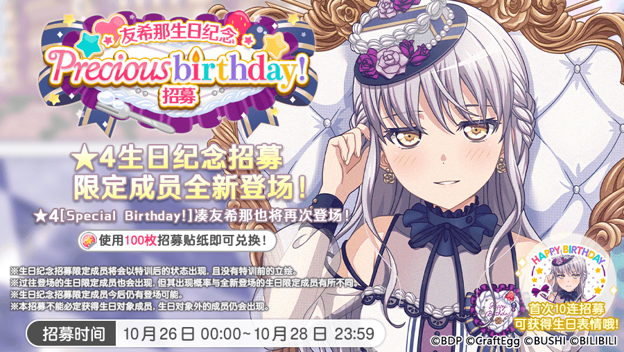 明天(10月26日)就是友希那生日了~明日起,游戏内将限时开放「友希那生日纪念Precious birthday!招募」!首次参与10连招募即可获得生日纪念限定表情,还请不要错过哦!此外,「★4凑友希那[Special birthday!]」也将在本次在招募中再次登场。※在本招募中出现的包括「★4凑友希那[Precious birthday!]」在内的所有凑友希那成员都将会比同稀有度下的的其