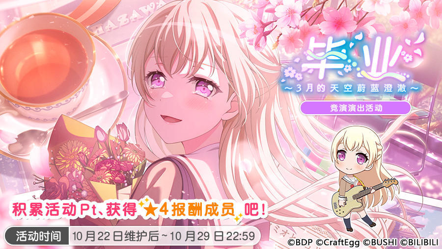 各位亲爱的BanG Dreamer: 10月22日维护后,游戏内将开启「毕业 〜3月的天空蔚蓝澄澈〜」竞演演出活动和「愿你前程似锦 3年份的回忆招募」,并追加翻唱歌曲《YELL》和原创歌曲《everyday flower》!游戏内还将开启「4.5周年开启预热 演出掉落UP活动!part2」,还请不要错过~此外,本次维护后,游戏内还将更新毕业季期间限定的区域场景和区域语音,欢迎大家登录游戏查看