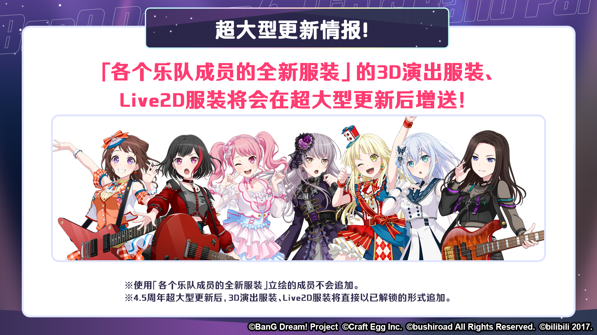 11月8日更新维护后,游戏内将赠送全员份的超大型更新全新服装(其中包含3D演出服装与Live2D服装),换上全新的服装去享受盛大的演出吧!※赠送的服装将在超大型更新后直接解锁。 今后也请多多支持《BanG Dream! 少女乐团派对!》!