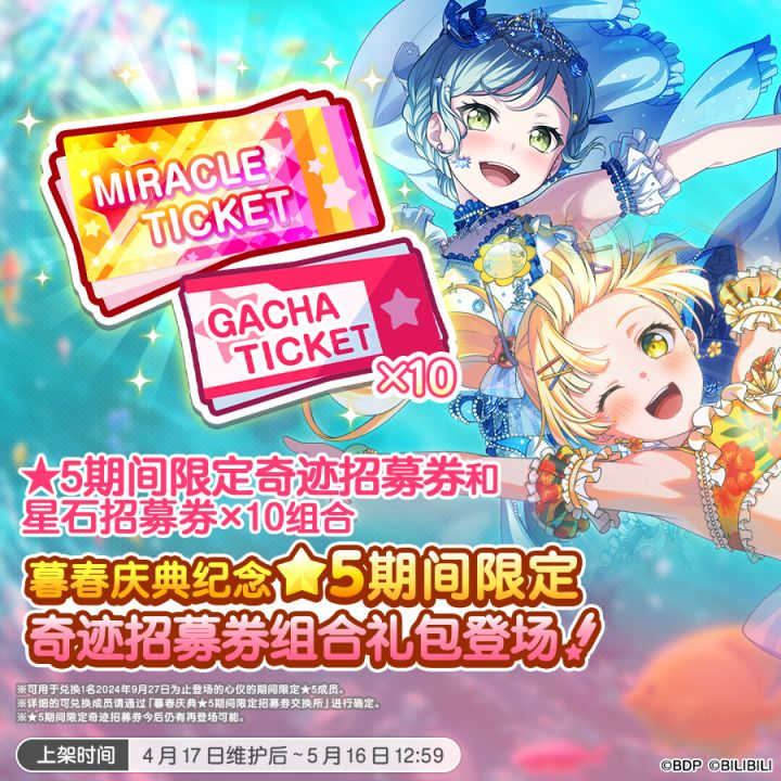 各位亲爱的BanG Dreamer: 为庆祝暮春庆典活动开启,4月17日维护后,4种招募券礼包将限时上架!届时,可以前往星石商店的礼包进行购买。 ★各礼包上架期间★4月17日维护后~5月16日12:59 一、「暮春庆典★5期间限定奇迹招募券礼包」★上架价格★付费星石2500个 ★礼包内容★·星石招募券×10·暮春庆典★5期间限定奇迹招募券×1(可兑换1名2024年9