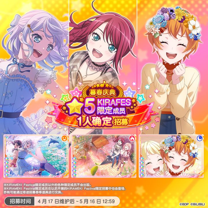 各位亲爱的BanG Dreamer: 为庆祝暮春庆典活动的开启,4月17日维护后,游戏内将开启全新「暮春庆典★5KiraFes限定成员1人确定招募」!活动期间仅限使用2500付费星石进行一次十连招募,且必得一位★5KIRAFES限定成员!★招募日程★4月17日维护后~5月16日12:59 ★招募内容★·10连招募(必得一位★5KIRAFES限定成员)※仅会出现★5KIRAFES