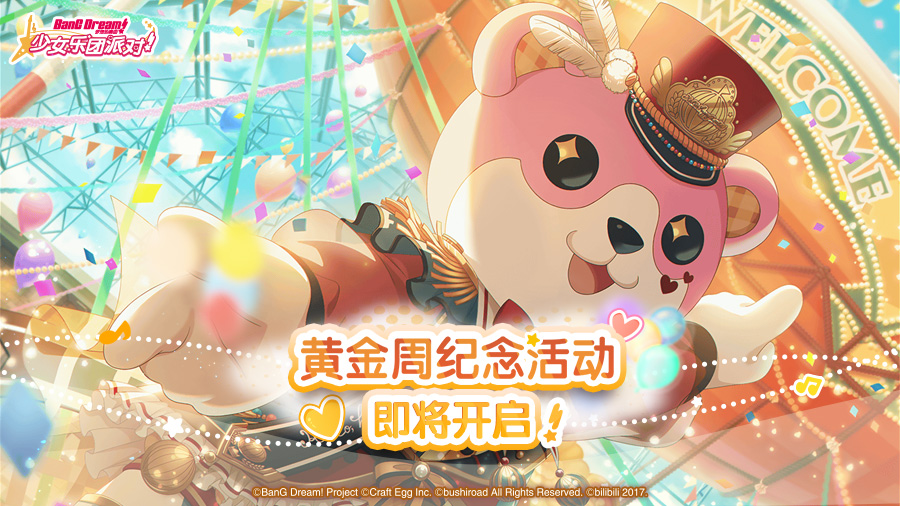 各位亲爱的BanG Dreamer: 「黄金周纪念」庆典活动即将开启!9月29日起,各类丰富活动陆续开启,更有4.5周年预热活动同步上线!「黄金周纪念 1日1次免费10连招募」、 「黄金周纪念★4初次获得期间限定成员1人确定招募」以及多首歌曲追加活动都将开启!更多活动详情请关注后续活动公告,黄金周相约CiRCLE哔哩店ヾ(*Ő౪Ő*)今后也请多多支持《BanG Dream! 少女乐团派对