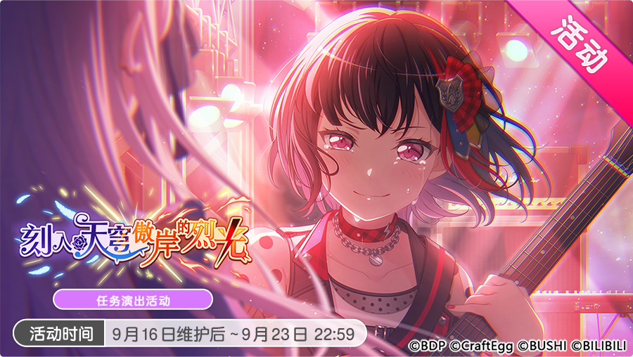 参与活动积累活动Pt,可以获得大量豪华奖励以及全新活动报酬成员哦!活动将于今日22:59结束,还请留意~ 今后也请多多支持《BanG Dream! 少女乐团派对!》!