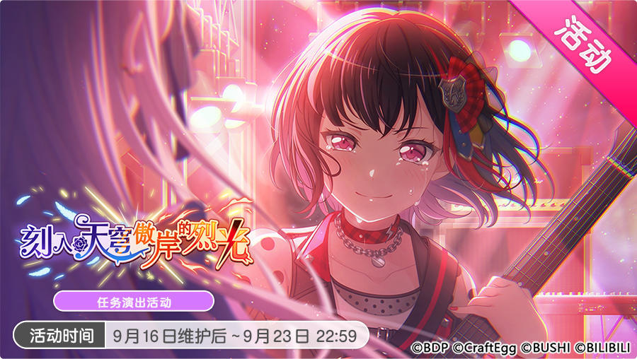 各位亲爱的BanG Dreamer: 9月16日维护后,游戏内将开启「刻入天穹傲岸的烈光」任务演出活动和「肆虐!咆哮的赤红獠牙招募」,并追加原创歌曲《IGNITE GLOW》!此外,游戏内将在维护后追加由MyGO!!!!!演唱的歌曲《迷路日々》及该曲MV♪欢迎大家登录游戏查看~ 一、「刻入天穹傲岸的烈光」任务演出活动开启!★活动日程★活动时间:9月16日维护后~9月23日22:59