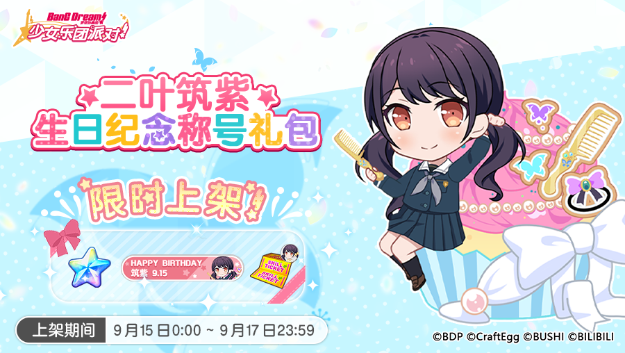 各位亲爱的BanG Dreamer: 为庆祝筑紫的生日,游戏内现已上架「筑紫生日纪念称号礼包」!礼包内含付费星石、生日纪念称号及生日成员专用技能练习券;生日纪念称号为简中版原创定制,希望大家能够喜欢ヾ(≧∇≦*)ヾ★上架期间★9月15日0:00~9月17日 23:59 ★礼包内容★「筑紫生日纪念称号礼包」:售价30元,购买后即可获得[付费星石×600]+[筑紫专用技能练习券×1