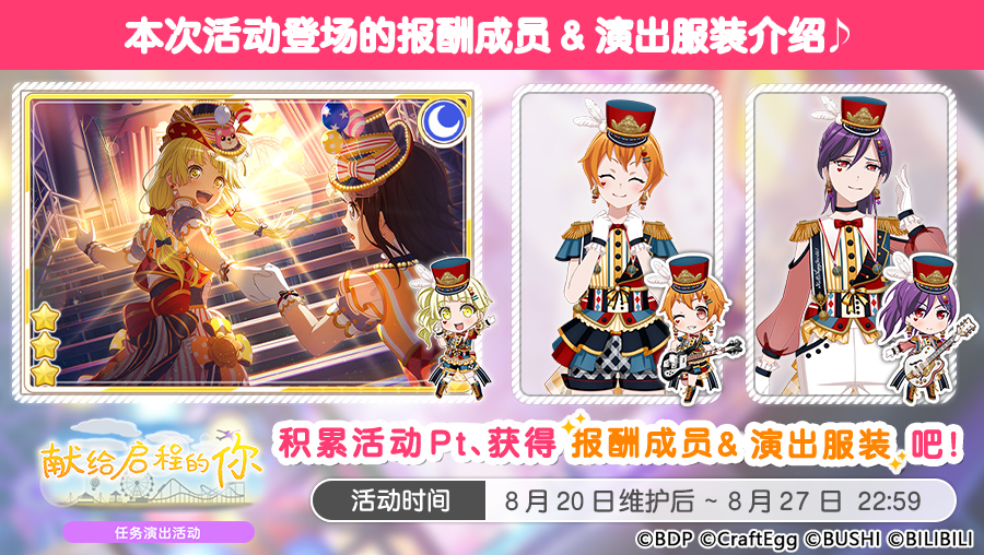 积累活动Pt即可获得附赠演出服装的全新活动报酬成员——★3 弦卷心[向着光的1,2,3]以及育美与薰的全新演出服装!!本期活动将于8月27日22:59结束,快来参与活动吧~ 今后也请多多支持《BanG Dream! 少女乐团派对!》!
