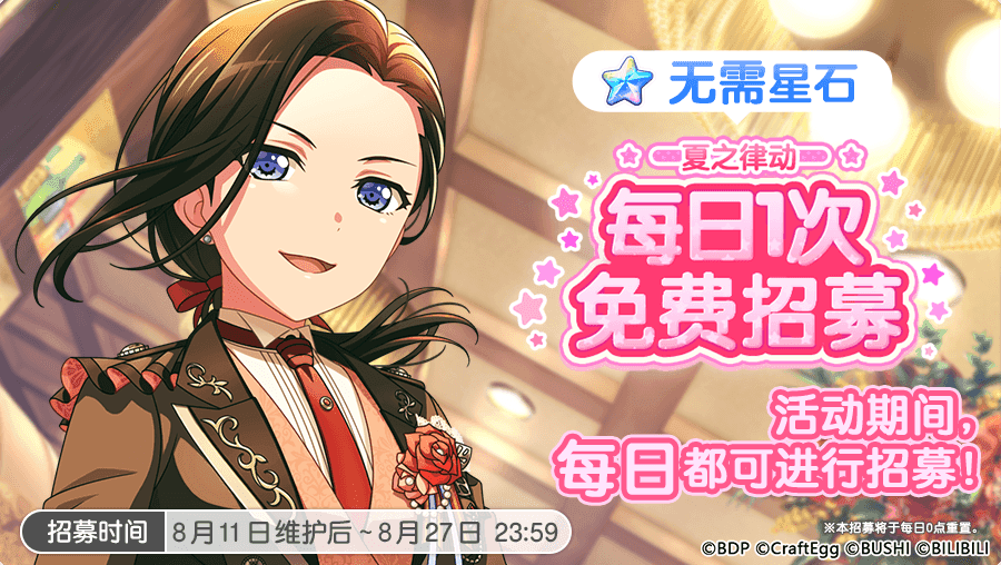各位亲爱的BanG Dreamer: 8月11日起,游戏内将开启连续17天·每日次数更新的免费招募——「夏之律动纪念·每日1次免费招募」!活动期间,累计可进行17次免费招募,还请不要错过~★活动时间★8月11日维护后~8月27日23:59※每日0:00~23:59期间限参加1次。 ★招募说明★1.本招募为免费进行的招募,每日免费招募时间为0:00~23:59,且每日0:00重置