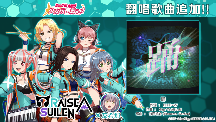 ★歌曲追加★曲名:踊演唱:RAISE A SUILEN×友希那※追加的翻唱歌曲现已上架CiRCLE乐曲商店,您可以使用音色水晶交换获得~
