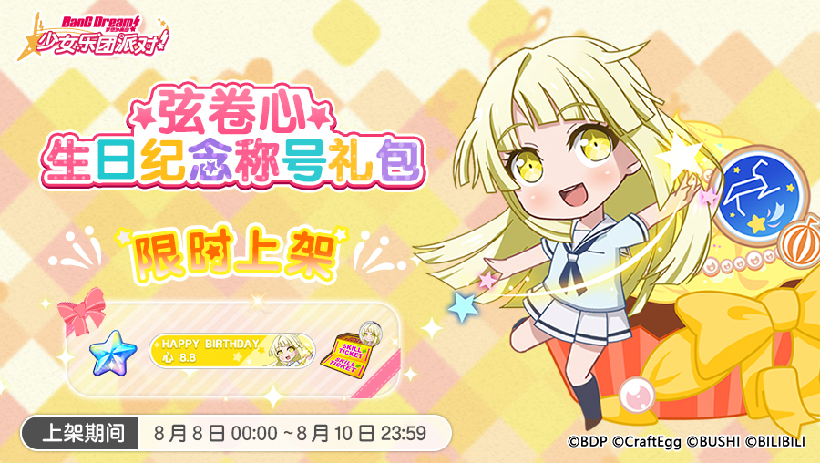 各位亲爱的BanG Dreamer: 为庆祝心的生日,游戏内现已上架「心生日纪念称号礼包」!礼包内含付费星石、生日纪念称号及生日成员专用技能练习券;生日纪念称号为简中版原创定制,希望大家能够喜欢ヽ(≧∀≦)ノ★上架期间★8月8日0:00~8月10日 23:59 ★礼包内容★「心生日纪念称号礼包」:售价30元,购买后即可获得[付费星石×600]+[心专用技能练习券×1]+[心生日