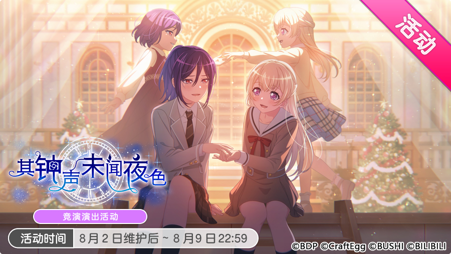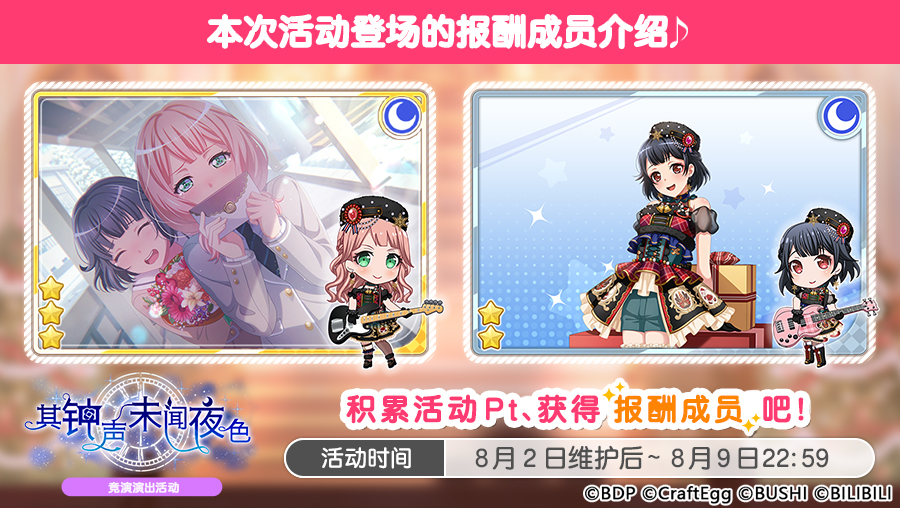 参与活动积累活动Pt,可以获得大量豪华奖励以及全新活动报酬成员哦!活动将于今日22:59结束,还请留意~ 今后也请多多支持《BanG Dream! 少女乐团派对!》!