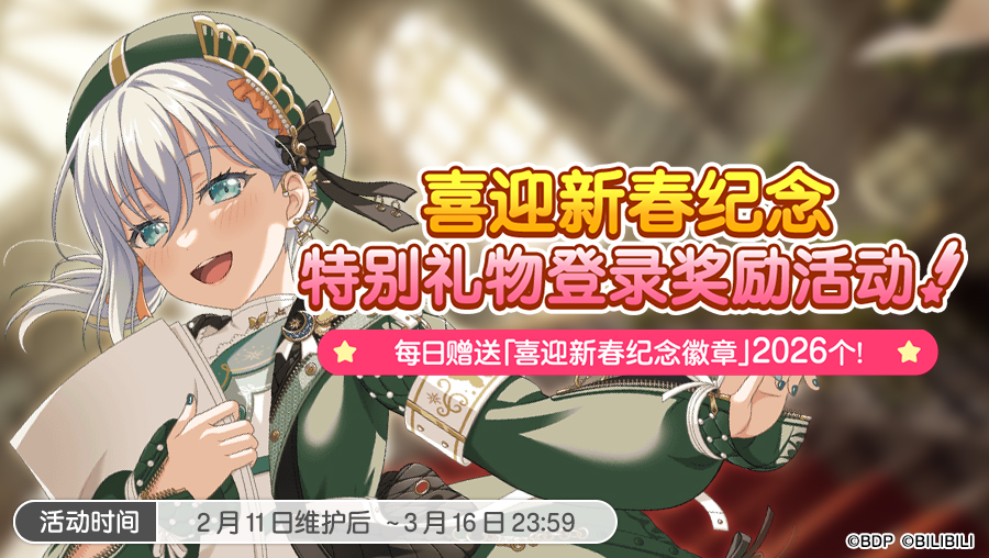 各位亲爱的BanG Dreamer: 为庆祝马年春节的到来,游戏内将于2月11日维护后开启「喜迎新春纪念徽章」特别礼物登录奖励活动!活动期间,每日登录游戏即可获得特殊道具「喜迎新春纪念徽章」,千万不要错过哦!★登录活动时间★ 2月11日维护后 ~3月16日23:59 ★每日登录奖励★「喜迎新春纪念徽章」×2026 ★登录活动参与方法★2月11日维护后~3月16日23:59期间每