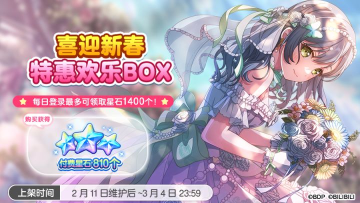 各位亲爱的BanG Dreamer: 为庆祝马年春节的到来,2月11日维护后,游戏内将限时上架「喜迎新春特惠欢乐BOX」!★上架期间★2月11日维护后~3月4日23:59 ★礼包内容★「喜迎新春特惠欢乐BOX」售价40元,购买后,可立即获得「付费星石×810」;此后7日可每日获得「免费星石×200」,最多可获得「免费星石×1400」!合计可获得「星石×2210」!活动期间限购1次!※