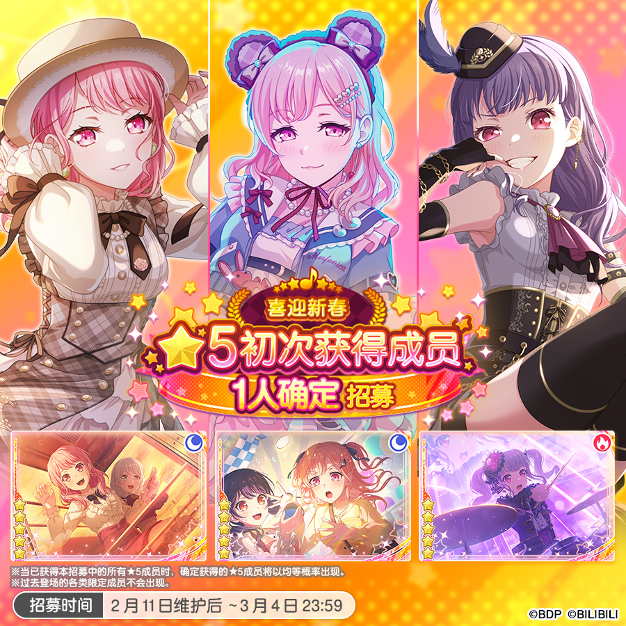 各位亲爱的BanG Dreamer: 为庆祝马年春节的到来,2月11日维护后,游戏内将开启「喜迎新春★5初次获得成员1人确定招募」!活动期间仅限使用2500付费星石进行一次十连招募,且必得一位初次获得的★5成员!★招募日程★2月11日维护后~3月4日23:59 ★招募内容★·10连招募(必得一位初次获得的★5成员)※仅出现截至2025年12月21日为止登场过的成员。 ★招募说明