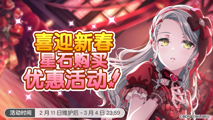 各位亲爱的BanG Dreamer: 为庆祝马年春节的到来,2月11日维护后,游戏内将开启「喜迎新春特惠档位」,充值可获得大量星石哦!★活动时间★2月11日维护后~3月4日23:59 ★优惠内容★活动期间,游戏内将开放以下3个档位的充值,各档位均限购3次。50元:可获得760(付费)+440(付费)个,共计1200个星石;限购3次。178元:可获得2650(付费)+1350(付费