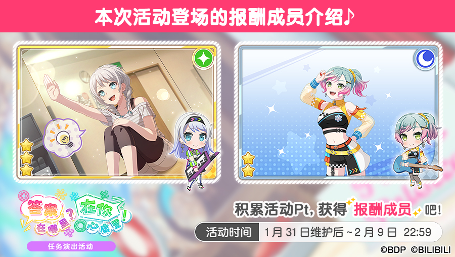 积累活动Pt即可获得附赠演出服装的全新活动报酬成员——★3 若宫伊芙[答题小课堂]、★2 冰川日菜[活力全开模式]!本期活动将于2月9日22:59结束,快来参与活动吧~ 今后也请多多支持《BanG Dream! 少女乐团派对!》!