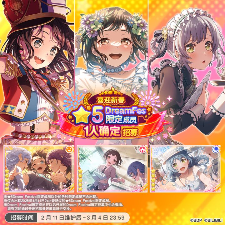 各位亲爱的BanG Dreamer: 为庆祝马年春节的到来,2月11日维护后,游戏内将开启全新「喜迎新春★5DreamFes限定成员1人确定招募」!活动期间仅限使用2500付费星石进行一次十连招募,且必得一位★5DreamFes限定成员!★招募日程★2月11日维护后~3月4日23:59 ★招募内容★·10连招募(必得一位★5DreamFes限定成员)※仅会出现2025年4月14日为