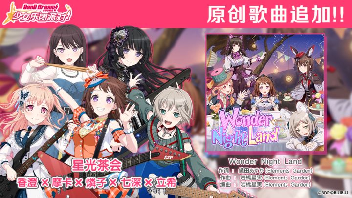 各位亲爱的BanG Dreamer: 为了庆祝《BanG Dream! 少女乐团派对!》首届世界性总选举(简中第四回)「星光茶会乐队」的胜出,游戏内现已追加首届世界性总选举(简中第四回)获胜纪念歌曲—《Wonder Night Land》♪★歌曲详情★曲名:《Wonder Night Land》演唱:星光茶会(香澄×摩卡×燐子×七深×立希)※追加的原创歌曲现已发放至您的礼物箱,还请您登