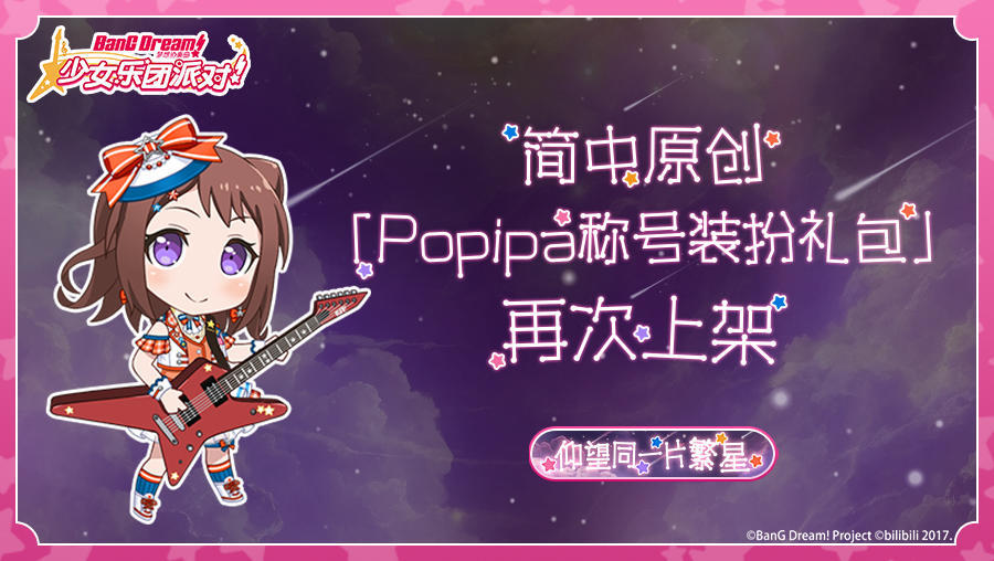 各位亲爱的BanG Dreamer: 12月21日维护后,游戏内将再次上架称号装扮礼包——「Poppin'Party称号装扮礼包」! 礼包内含简中原创·Poppin'Party专属称号「仰望同一片繁星」、Poppin'Party专用技能练习券及星石招募券~还请不要错过!“同一片星空下的约定”★上架期间★12月21日维护后~1月20日12:59 ★上架价格★付费星石1000个 ★