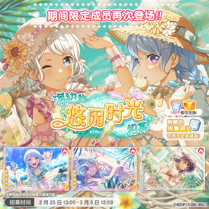 各位亲爱的BanG Dreamer: 2月25日,游戏内将开启「海边的悠闲时光招募」,2025年1月27日~2月3日开展的「海边的悠闲时光招募」中出现的期间限定成员再度登场!本招募附赠「海边的悠闲时光招募碎片」,使用招募碎片可以在「海边的悠闲时光招募碎片交换所」获得「EX星光魔方」!此外,使用付费星石×2000可进行「仅限5次的10连招募」,还可以获得更多「海边的悠闲时光招募碎片」!★招