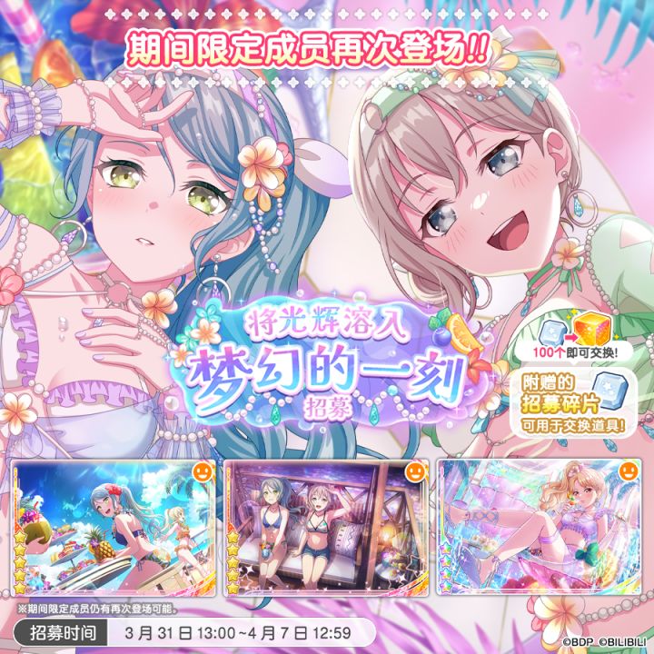 各位亲爱的BanG Dreamer: 3月31日,游戏内将开启「将光辉溶入梦幻的一刻招募」,2025年2月17日~2月23日开展的「将光辉溶入梦幻的一刻招募」中出现的期间限定成员再度登场!本招募附赠「将光辉溶入梦幻的一刻招募碎片」,使用招募碎片可以在「将光辉溶入梦幻的一刻招募碎片交换所」获得「EX星光魔方」!此外,使用付费星石×2000可进行「仅限5次的10连招募」,还可以获得更多「将光辉