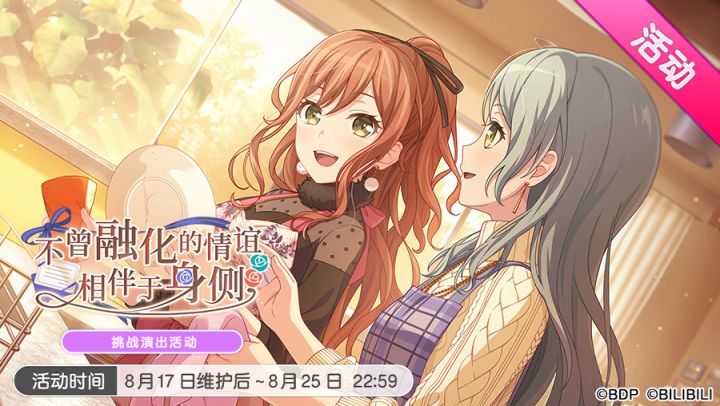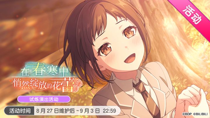 各位亲爱的BanG Dreamer: 8月27日维护后,游戏内将开启「在春寒中悄然绽放的花蕾」试炼演出活动、「守望着春天的少女们的洋馆招募」和「★2・★3・★4角色加成对象成员确定招募」,并追加原创歌曲《花笑みのデュオ》! 欢迎各位BanG Dreamer登录游戏查看哦~ 活动一、「在春寒中悄然绽放的花蕾」试炼演出活动开启!★活动日程★8月27日维护后~9月3日22:59 ★