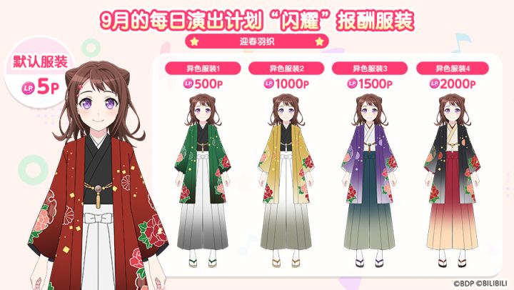 各位亲爱的BanG Dreamer:9月【每月演出计划】即将于9月1日0:00开启,购买闪耀演出计划后即可领取对应的【闪耀】报酬,可以获得全新的3D演出服装哦!【闪耀演出计划价格】78元 【礼包内容】付费星石×1200每月演出计划「闪耀」报酬解锁 【关于每月演出计划「闪耀」报酬】1、每月演出计划「闪耀」购买「闪耀演出计划PASS」后即可解锁,收集演出点数即可获得追加报酬。 2