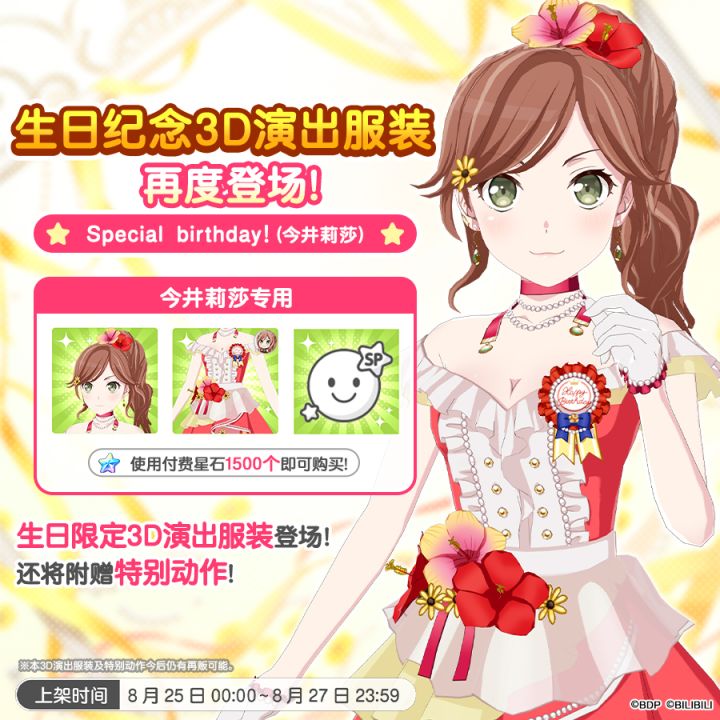各位亲爱的BanG Dreamer: 游戏内现已再次在星石商店上架「莉莎生日纪念3D演出服装」!您可以前往星石商店进行选购~★贩售时间★8月25日0:00~8月27日23:59 ★贩售价格★付费星石×1500 ★3D演出服装内容★3D演出服装「Special Birthday(今井莉莎)」・Special birthday!(今井莉莎)「服装+发型・饰品」・动作「准备完毕☆