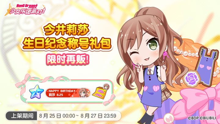 各位亲爱的BanG Dreamer: 为庆祝莉莎的生日,游戏内现已再次上架「莉莎生日纪念称号礼包」!礼包内含付费星石、生日纪念称号及生日成员专用技能练习券;生日纪念称号为简中版原创定制,希望大家能够喜欢~※本次生日纪念称号礼包为再贩礼包,此前曾获得该称号的玩家在再次购买该礼包后将无法重复获得生日纪念称号,还请留意。★上架期间★8月25日0:00~8月27日23:59 ★礼包内容★「