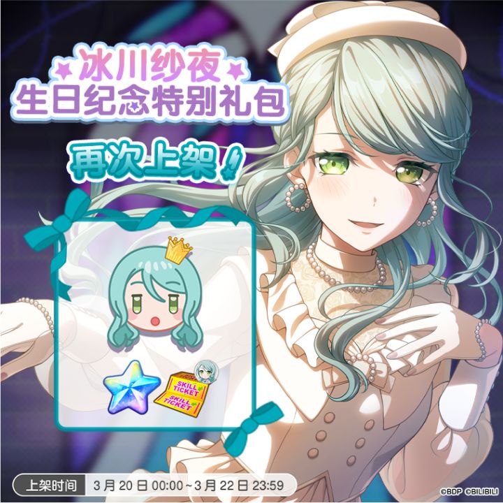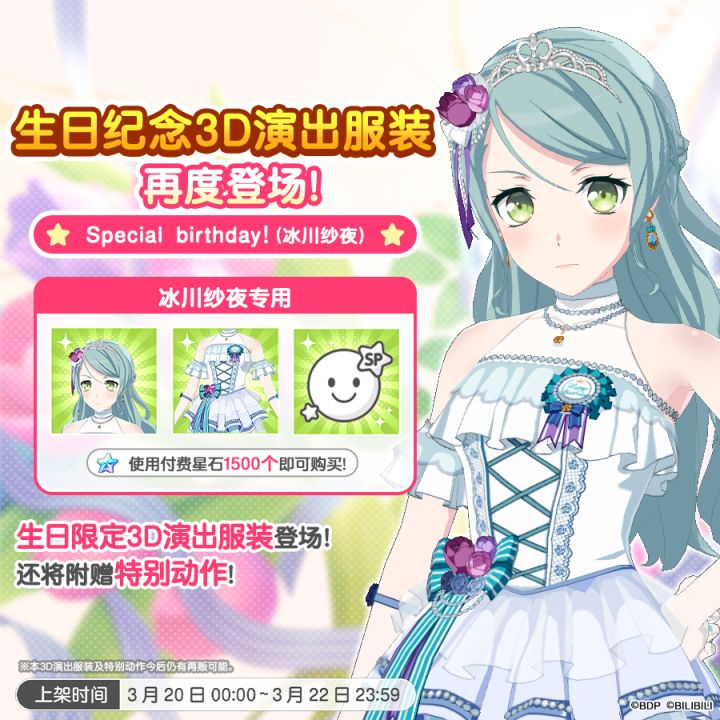 各位亲爱的BanG Dreamer: 游戏内即将再次在星石商店上架「纱夜&日菜生日纪念3D演出服装」!您可以前往星石商店进行选购~★贩售时间★3月20日0:00~3月22日23:59 ★贩售价格★付费星石×1500 ★3D演出服装内容★・3D演出服装「Special Birthday(冰川纱夜)」・Special birthday!(冰川纱夜)「服装+发型・饰品」・动作