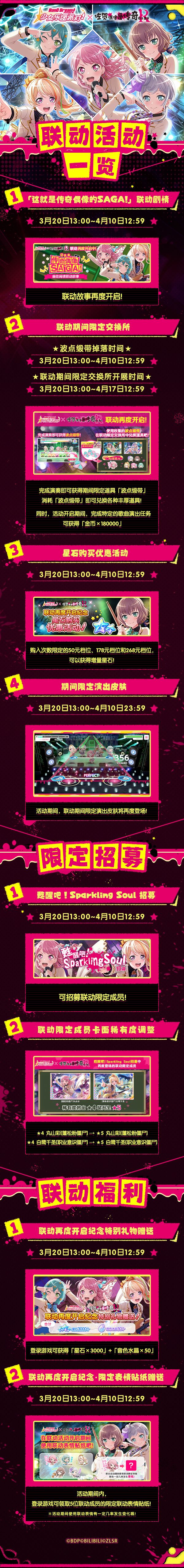 #BanG Dream! 少女乐团派对!#×#佐贺偶像是传奇 卷土重来# 联动现已再度开启!联动限定成员、联动任务、限定装饰及特别活动故事等精彩内容登场,活动期间还可领取丰厚星石奖励及各类限定素材,并体验联动专属演出界面及打歌体验!同时,本次联动活动期间中,联动限定活动故事「这就是传奇偶像的SAGA!」的解锁条件将由Pastel*Palettes乐队等级10级上变更为无条件解锁,大家千万不要错