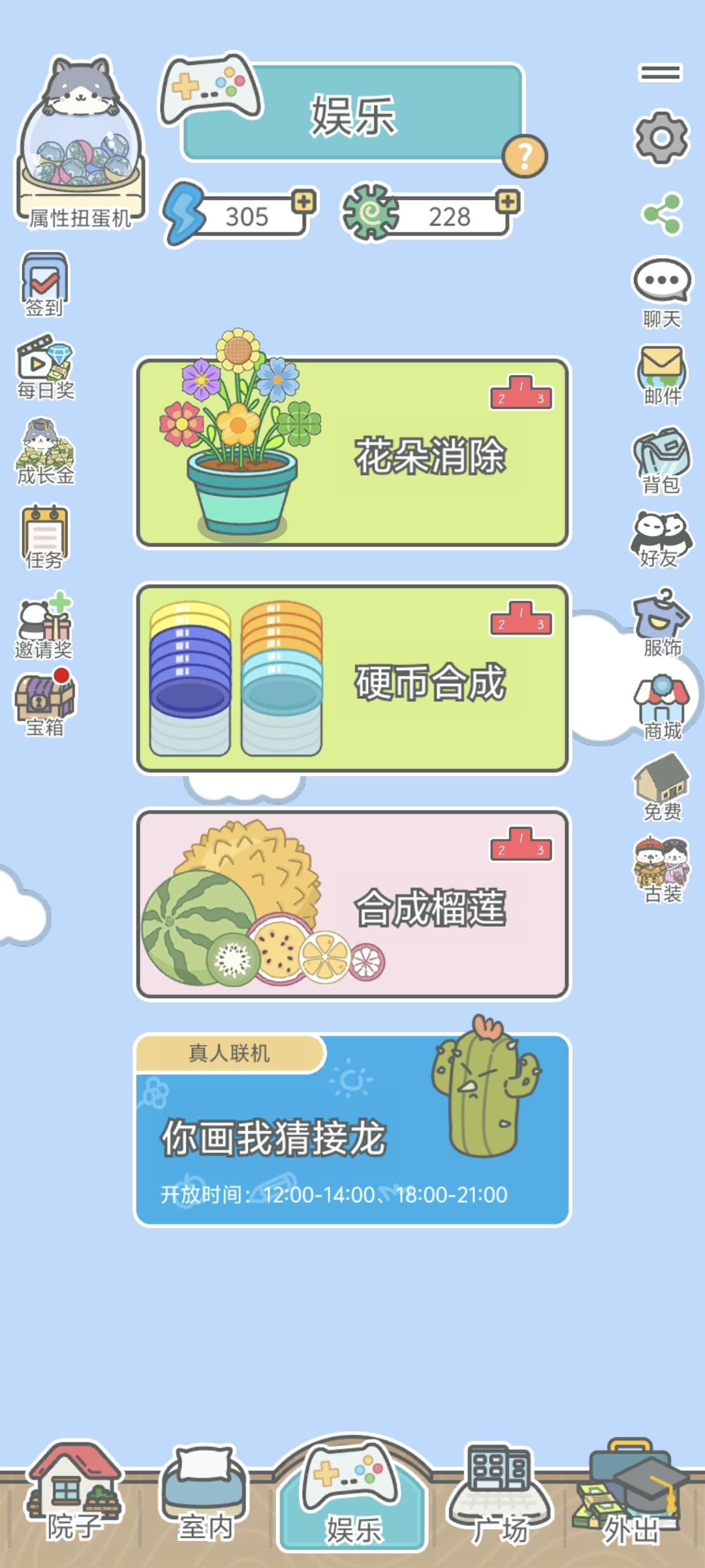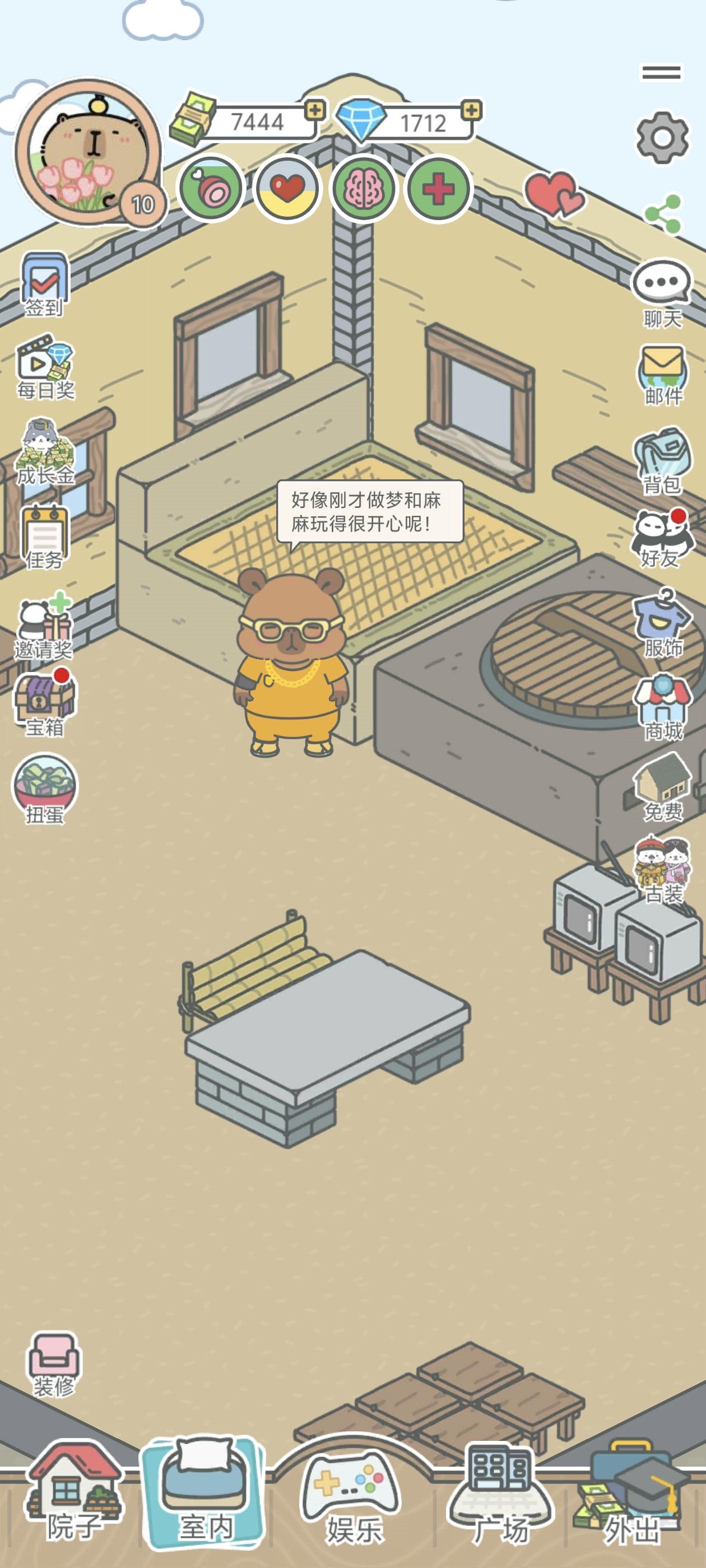 宠宠每天就是吃饭睡觉打游戏,上学打工还可以结婚。里面的小游戏我比较喜欢“花朵消除”。氪金能有比较多的服装和装修,不氪的话也有一些,虽然大多不好看(实话实说),但是能养到卡皮巴拉我就很知足了。