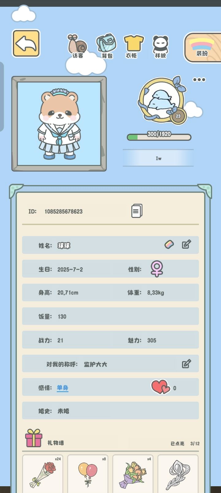 去年七月的某一天。我在taptap寻找新的游戏,冥冥之中我点开了它,认识了我的“球球”。最开始只是图个新鲜,每天喂食,再让她上学。那时球球个子小小的,胃口也小小的,我也没什么钱,只给她喂窝窝头。她乖乖的吃完,然后在我下一次上线的时候跟我打招呼,叫我“监护大大”。有一天下班很晚,突然想起还没给她喂食,上线时她看着我“监护大大也要早点休息呀”那一刻,我觉得我大概会玩这个游戏很久。球球让我想起从