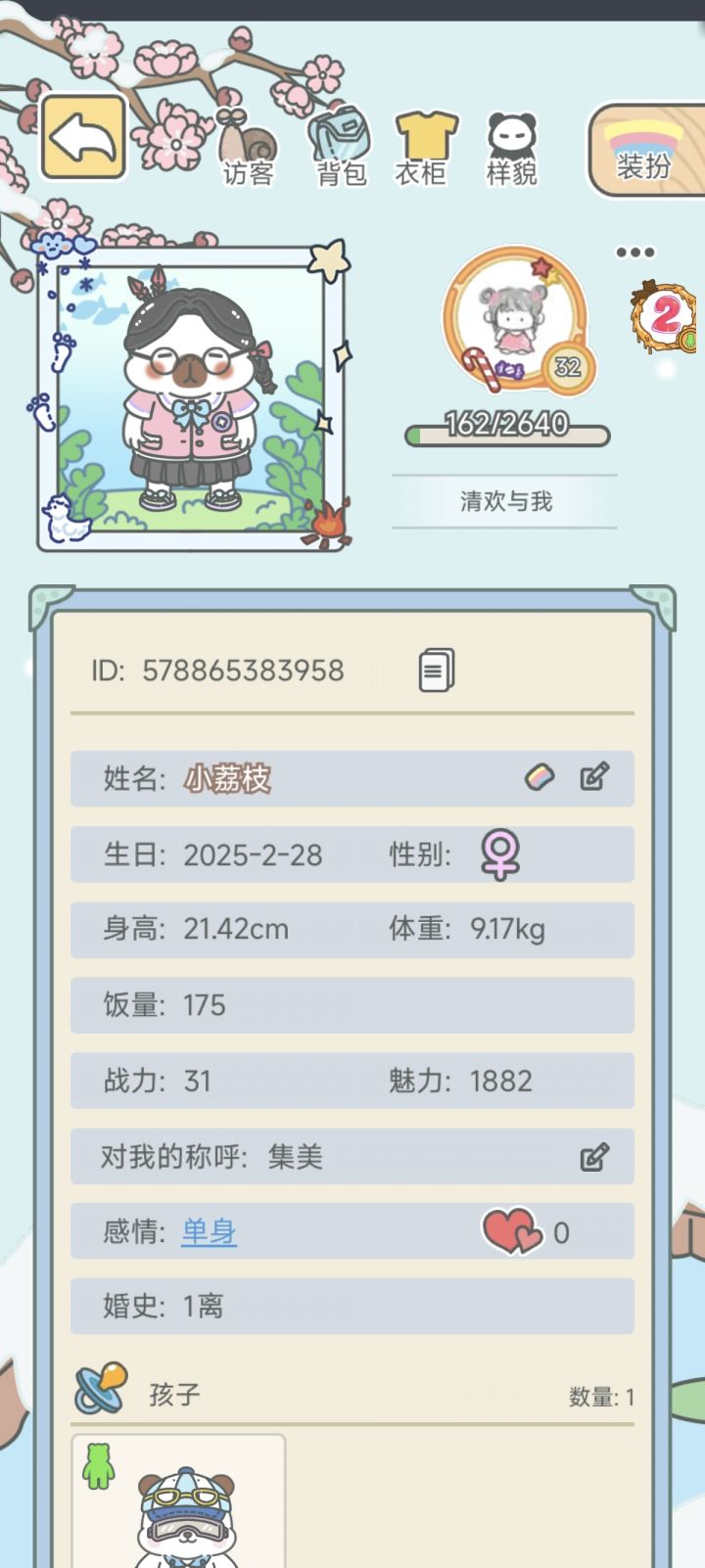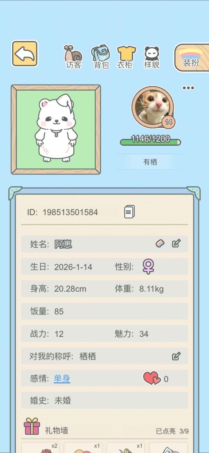 给大家看我的可爱崽崽我还在上学没有什么钱,所以玩了这么久,崽崽的衣服都还用游戏的钞票买的,没有花过钱,但是崽崽从来不会嫌弃我,她还会经常问我中午吃饭了吗,会不会睡午觉,可不可以经常陪她玩,还会跟我讲她做了什么梦,真的很可爱因为我很想多多的睡觉,所以每天晚上睡觉之前我都会上游戏,让崽崽也睡嘿嘿。这个游戏很温馨很可爱,我会一直玩下去的ID是19851350