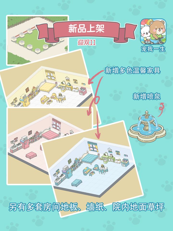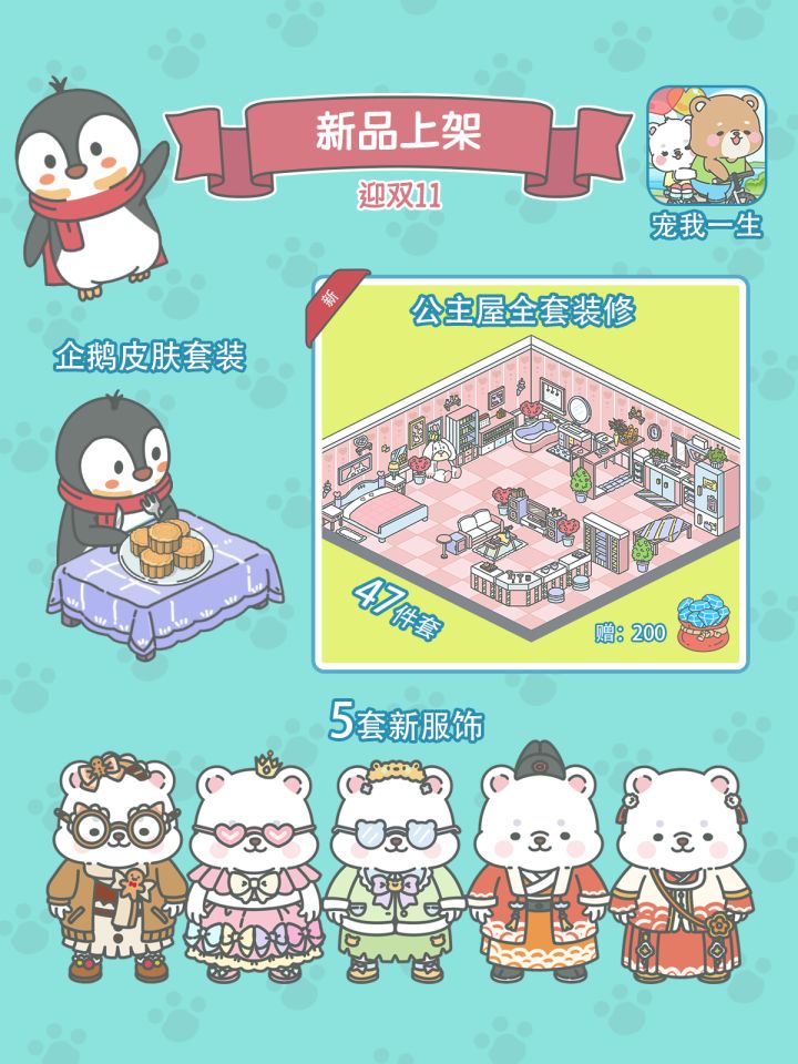 11月10日14:00本次版本更新内容:1,新增连体套装模式,增加了企鹅皮肤套装,注意企鹅是衣服,后续也会推出更多样式的连体套装;2,增加了5套新衣服,如图;3,商店里的装扮页增加了“家居”的整体售卖,此次增加了公主屋套装、粉色田园套装;4,家居城里增加了多套颜色的家具和地面;6,增加了多套院子地面、围墙、炮塔;7,衣柜增加了战斗服选项,日常服用于宠物身上的显示,战斗服仅用于战力的显示