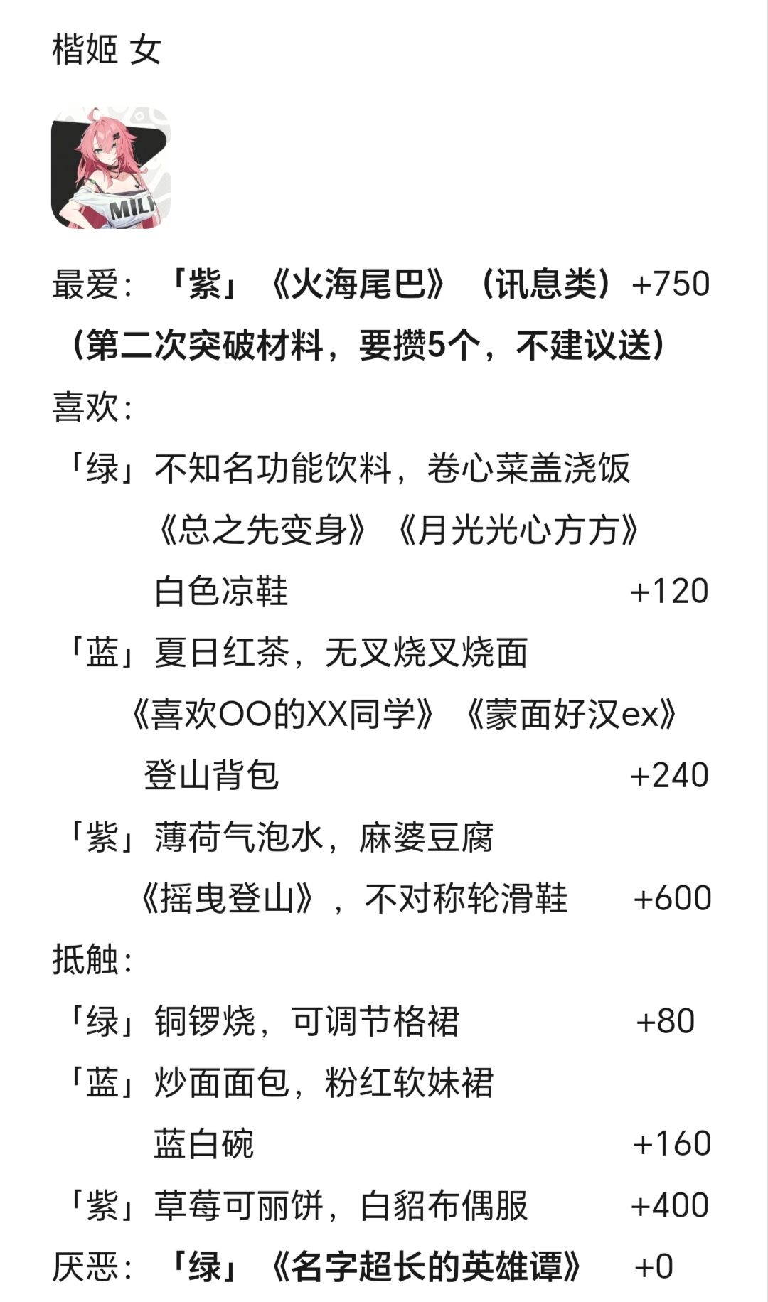 角色好感度礼物送礼大全(楷姬、谭山瞳等)
