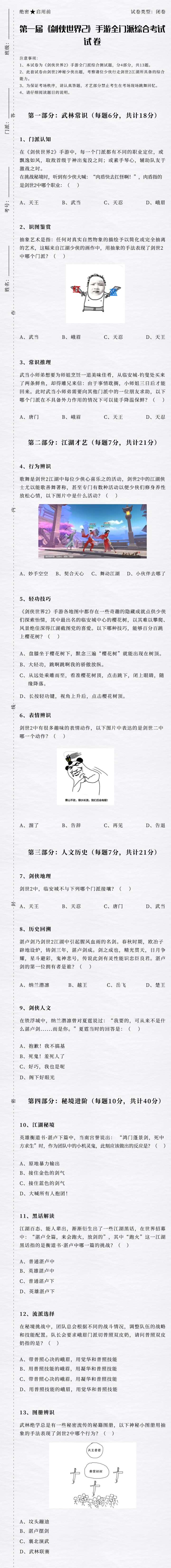 今天一定有很多高考适龄少侠放假啦!终于可以吹着空调吃着西瓜,等着《剑侠世界2》手游正式公测的日子。预约了,放假了,万事俱备……且慢!进入《剑侠世界2》手游江湖之前,这些走江湖必备的常识你都了解吗?剑娘今天就带着有爱少侠一起出的题目来考考各位!快来答题吧!