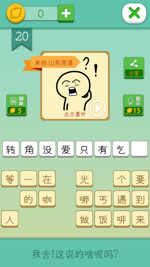 建议下个版本增加一些山东关卡,山东人表示60关就这一个,看到这一关贼激动,虽然不是本地的2333