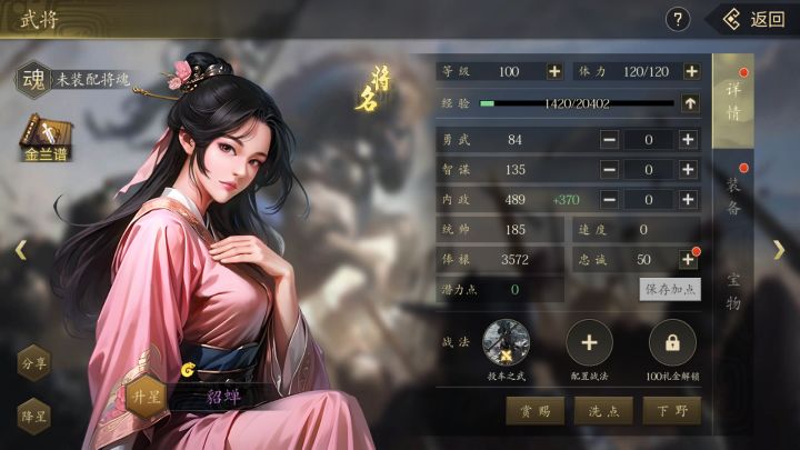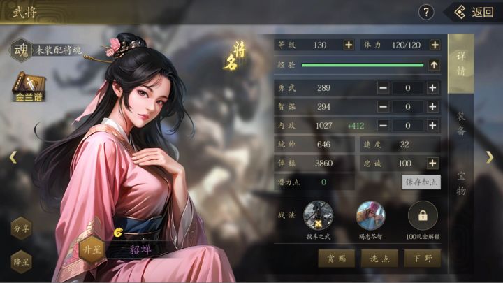 一、洗点技巧在游戏中玩家可对将领进行洗点,进行洗点时需要消耗道具“洗髓丹”(洗髓丹可以通过商场购买、活动赠送、野地掉落获得)。在对将领进行第一次洗点时会将武将的初始勇武、智谋、内政属性点根据固定的百分比转换为潜力点,同时也会加上将领等级转换为对应的潜力点。具体的公式是(勇武+智谋+内政)×0.26+将领等级所加潜力点=洗点潜力点(建议优先提升勇武属性) 二、洗点方法玩家可以将洗出的潜力点主