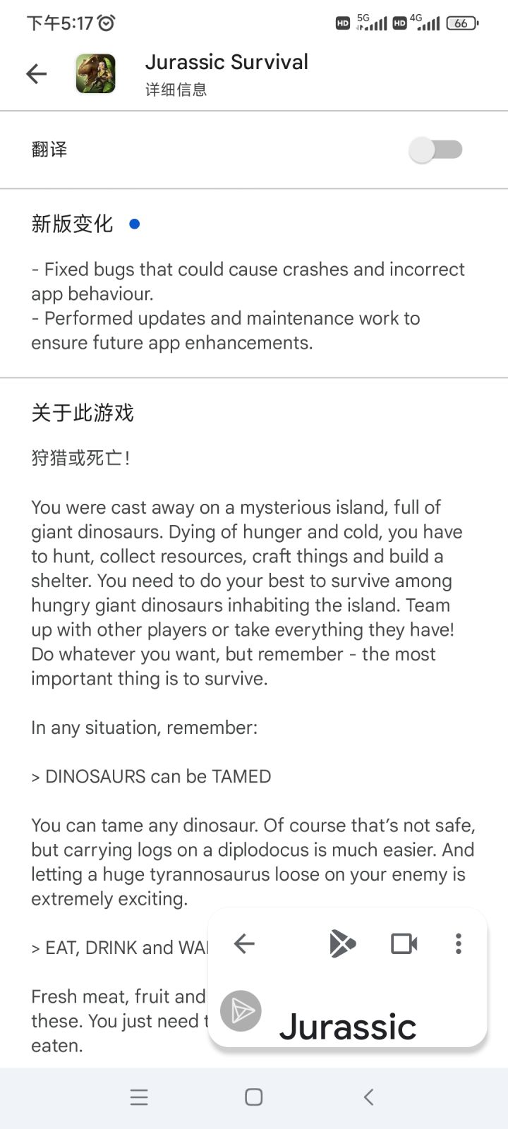 昨天在谷...哥商店找恐龙游戏。发现新推出的。图片很吸引。下载玩叭。玩了即时中毒。移动角色向上行,它向下。开箱子无物品。杀恐龙无皮、肉。还有很多,不说了。重点是...几秒來广告。几秒就來广告(这游戏不连网无广告)。这游戏差劣...根本没完成开发就推出。(后话...100分,只给5分。那些恐龙、狼、熊、僵尸,还好看。)
