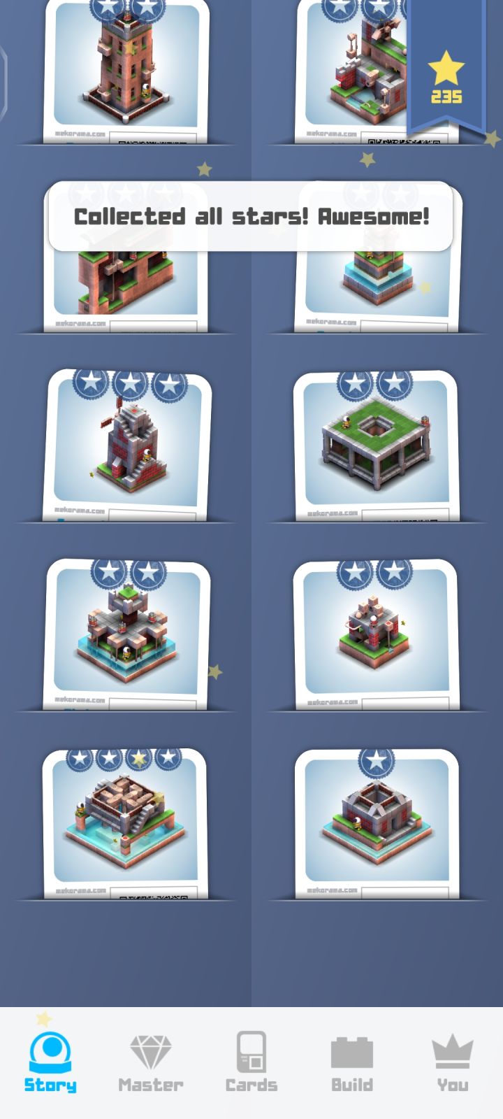 游戏自带120个关卡,分为Story模块80关和Master模块40关。Story模块中,每关需要收集1~4颗不等的星星,但许多机关只能使用一次,许多地点也是“没有回头路”,因此Story模块主要考验玩家的路线规划以及对各类机关的理解和运用。Master模块中每个关卡则只需要收集一颗星星,但每一关都有其独特的“点子”:打高尔夫球、投篮、华容道、孔明锁、三维弹球,甚至有一关需要主动让机器人被电晕从而摔到本来走不过去的地方………Master模块的关卡设计较Story模块更跳脱、更具有想象力,你永远也不知道下一个关卡是运动游戏还是解谜游戏,亦或是考察创新思维(比如主动跳到地图外面去“送死”才能吃到星星),像是吃一盒什锦味糖果,每一颗都充满惊喜。