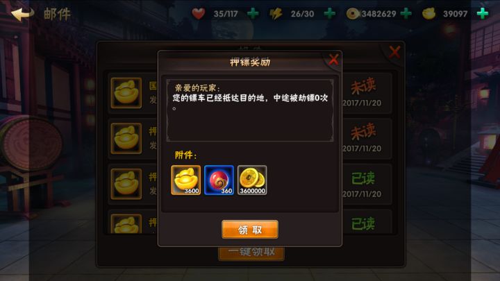 其实押镖就算被抢也是不会亏得。原理是你把元宝压出去半小时,回来变多。被抢只是在变多的那部分里减少。例如压1200元宝,收益双倍的时候,花一千压红车,不被抢收益是 2400,被抢最多是减少1000。算下来,1200+2400-1000=2600假如被抢,最多-1000,减去压的元宝1200基础收益还是有500左右的。这是不被抢的图。总结,压红车。1200元宝,过程就是1.自己的元宝数-2