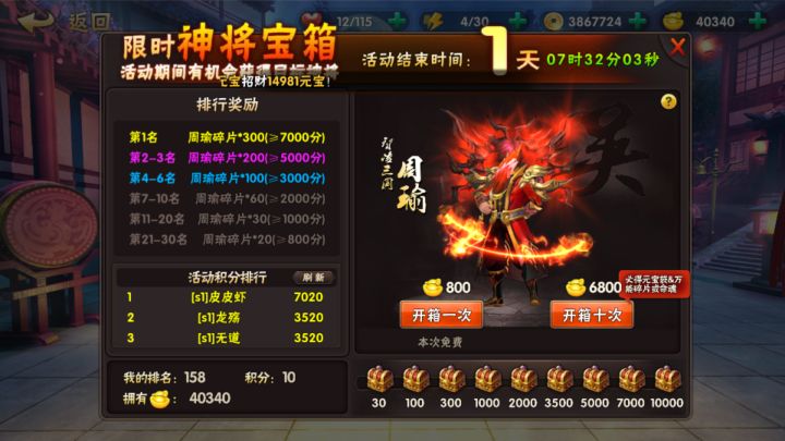先声明,我冲了100,俩月卡。前期尽量不要去一个劲儿的抽卡,前三天的活动很好但是最好去做周瑜的,第三天下午会出周瑜活动。23W搞一个SS的周瑜养着就行。(开箱子一次6800,也能开出元宝,数量到了也有元宝,所以19W就差不多)武将没必要搞太多。万能碎片都留给SS,不要乱用。还有嘉年华的,一天出一些任务,你们自己看着办。前两天的就这些,推图啥的自己搞去,花点时间而已。没啥要注意的。因为等级卡