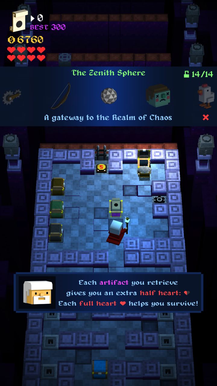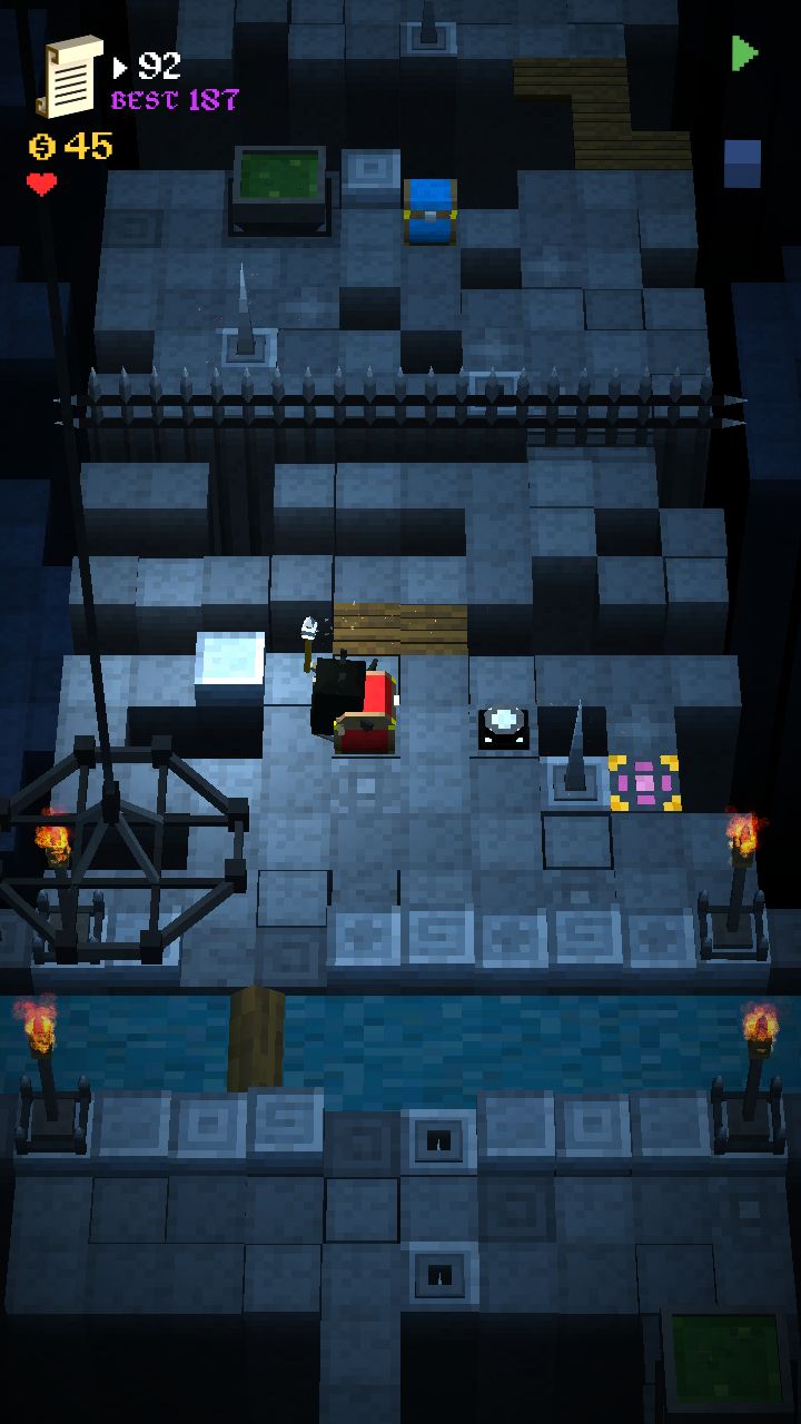 本游戏收集要素超多,帽子、法杖、鞋子都有很多种可以买,我就不一一介绍了,着重说下重要的道具。Nimble Boots of the Oracle's Servant(神之使者的敏捷之靴,简称跳鞋),让你的角色可以跳过一个空格。游戏中最重要的道具,有了这个鞋子简直就是让角色插上了想象的翅膀,通关不再是难事。注意跳起来后可以在空中左转、右转或者往回转!!开始画面中间的台子可以购买新地图,用跳鞋配