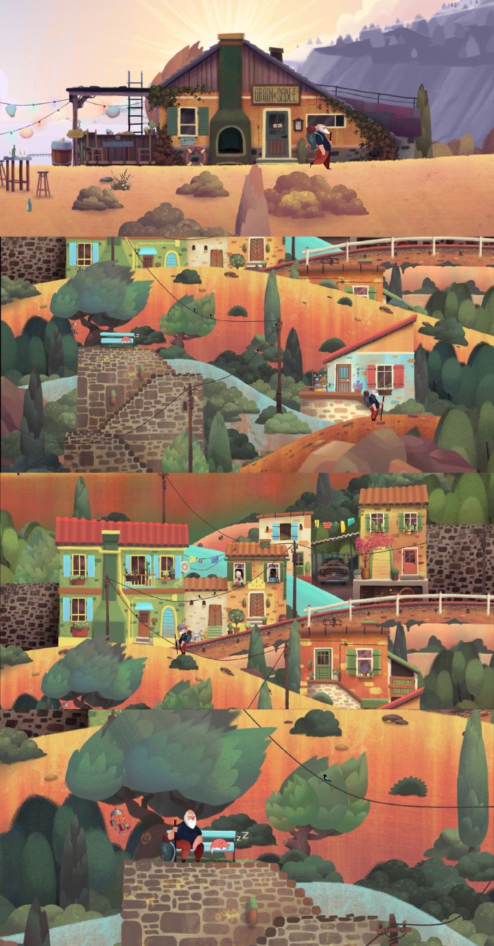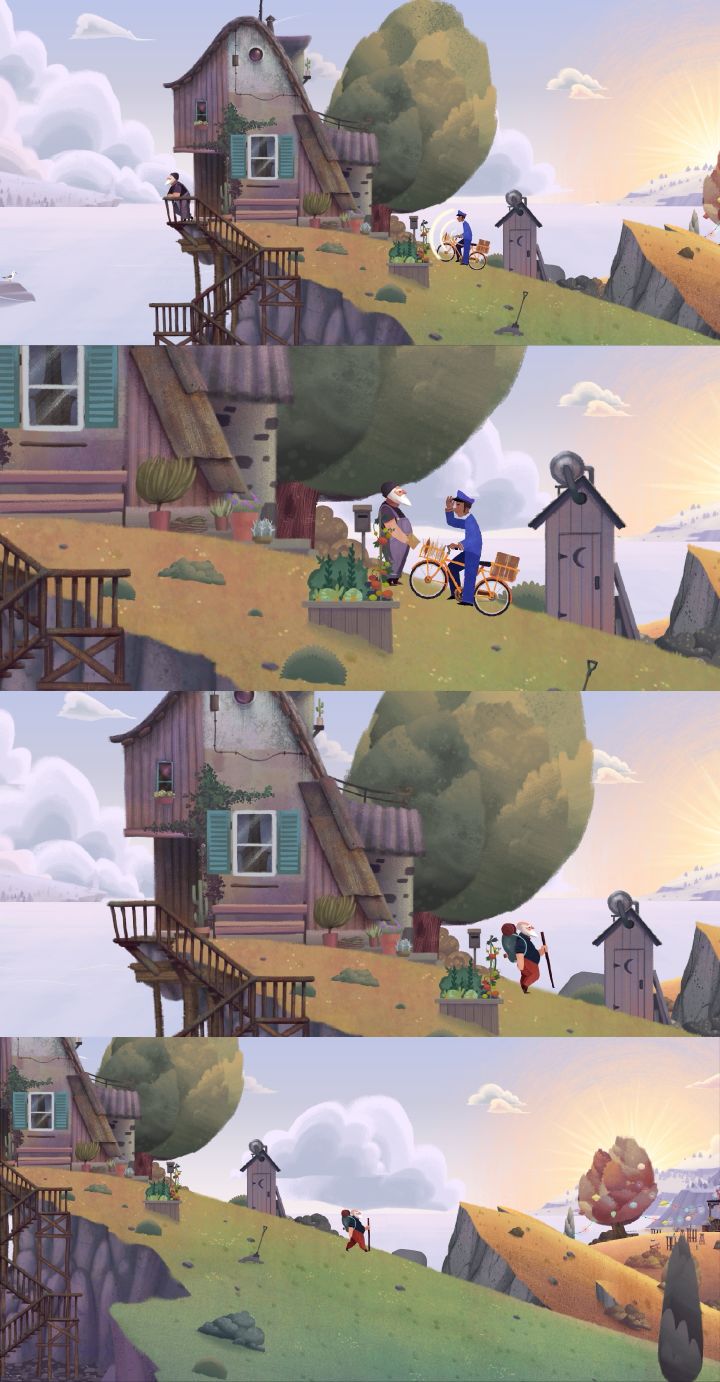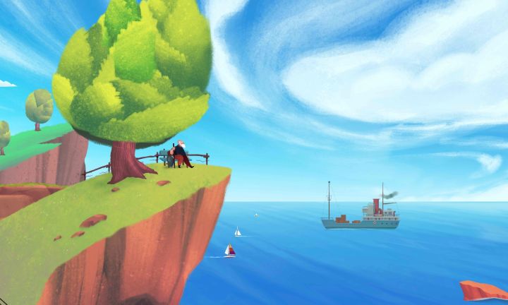 游戏画面太美了,绵延不绝的山峰、参差交错的小道、汩汩流淌的河水、广阔无垠的大海、波光粼粼的落日、波折起伏的公路、绿意盎然的草原、风雨交加的峡谷、风和日丽的天空、冰冷幽深的湖底、鲜花遍布的故乡……一幕幕回忆随着老人的步伐呈现在眼前。故事从老人收到家人的信开始。老人年轻时是一名水手,在一个酒会上遇到了心爱之人。他们一起驾车出游,一起领略美好风光。终于,在一艘小船上,他向心爱的女孩求婚。他们结为夫妻,