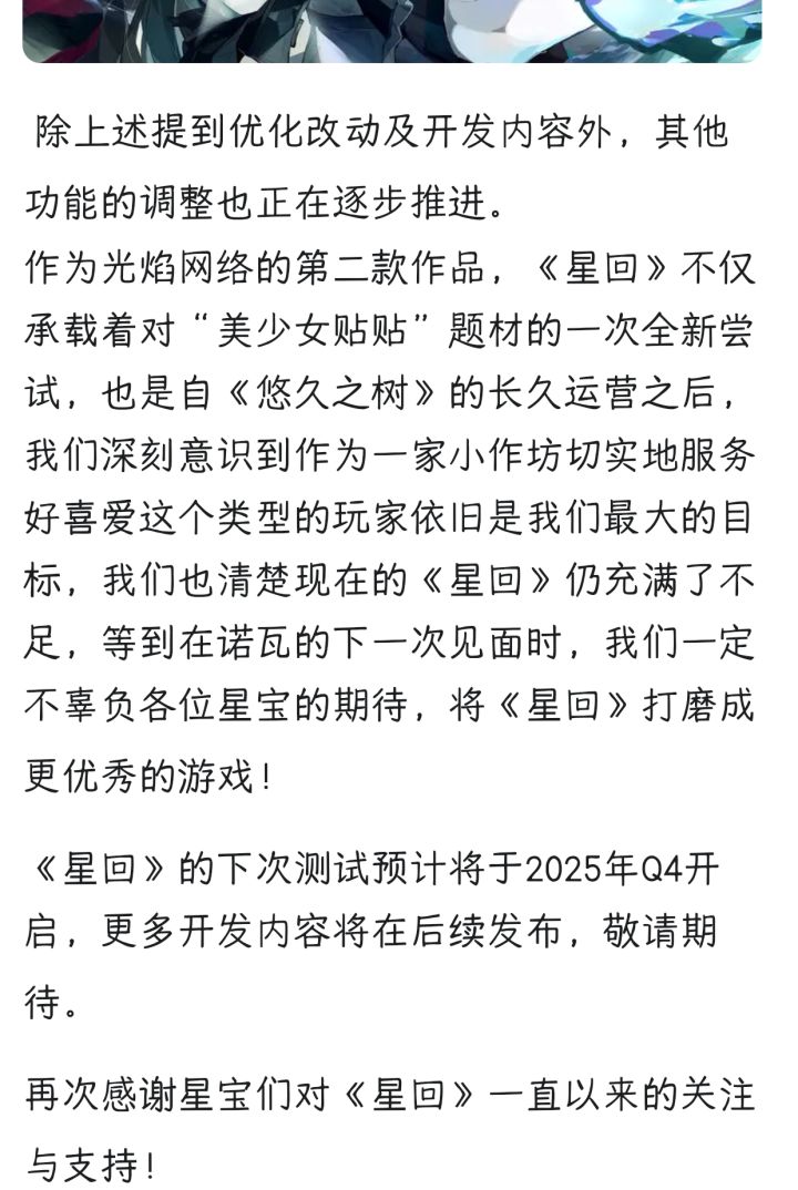 亲爱的星宝们:时光荏苒,许久不见。这里是《星回》项目组。2025年对众多游戏公司而言都是充满挑战的一年,我们亦不例外。经过反复的研讨与反思,我们决定对《星回》的战斗玩法、数值体系进行全面重制,回归到我们更为擅长的类《悠久之树》模式。在此基础上,我们将根据《星回》的定位,对部分系统玩法进行相应的调整。由于此项调整的工作量十分庞大,我们不得不推迟原定的测试计划。在此,我们要向所有星宝致以最诚挚的