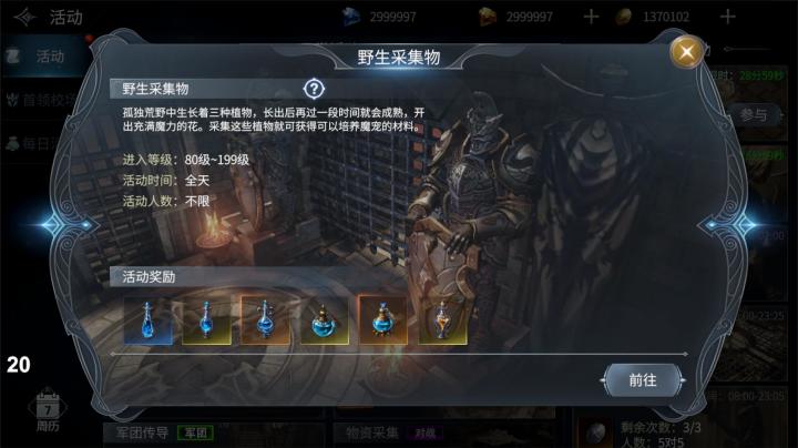 各位觉醒者进入游戏后,会看到我们的【日常活动】功能,今天我们来介绍的是“其他”活动。其他活动中主要包括“野生采集物”这一个活动。觉醒者们等级达成80级解锁孤独荒野地图之后即可参加该活动。在野外开放大世界中有可供觉醒者自由采集的野生采集物三生荆棘、龙息草和紫幻幽兰,它们生长于孤独荒野地图中,觉醒者可前往进行自由采集,采集完成后获得到丰厚的魔宠养成道具奖励,同时采集物会消失,经过一段时间之后会自动刷